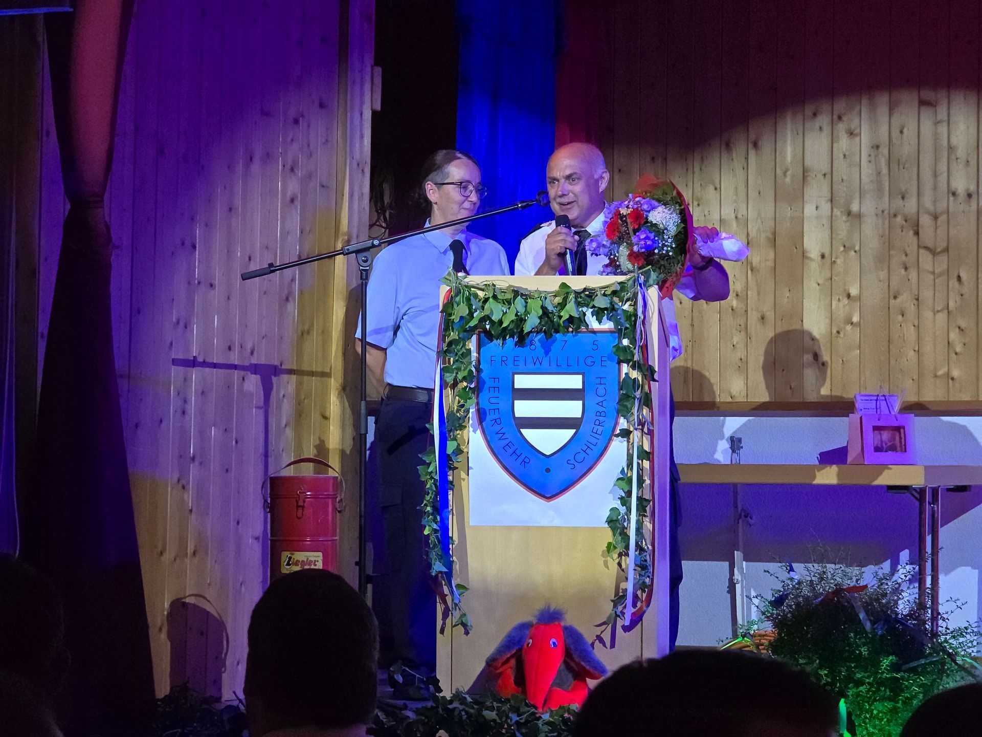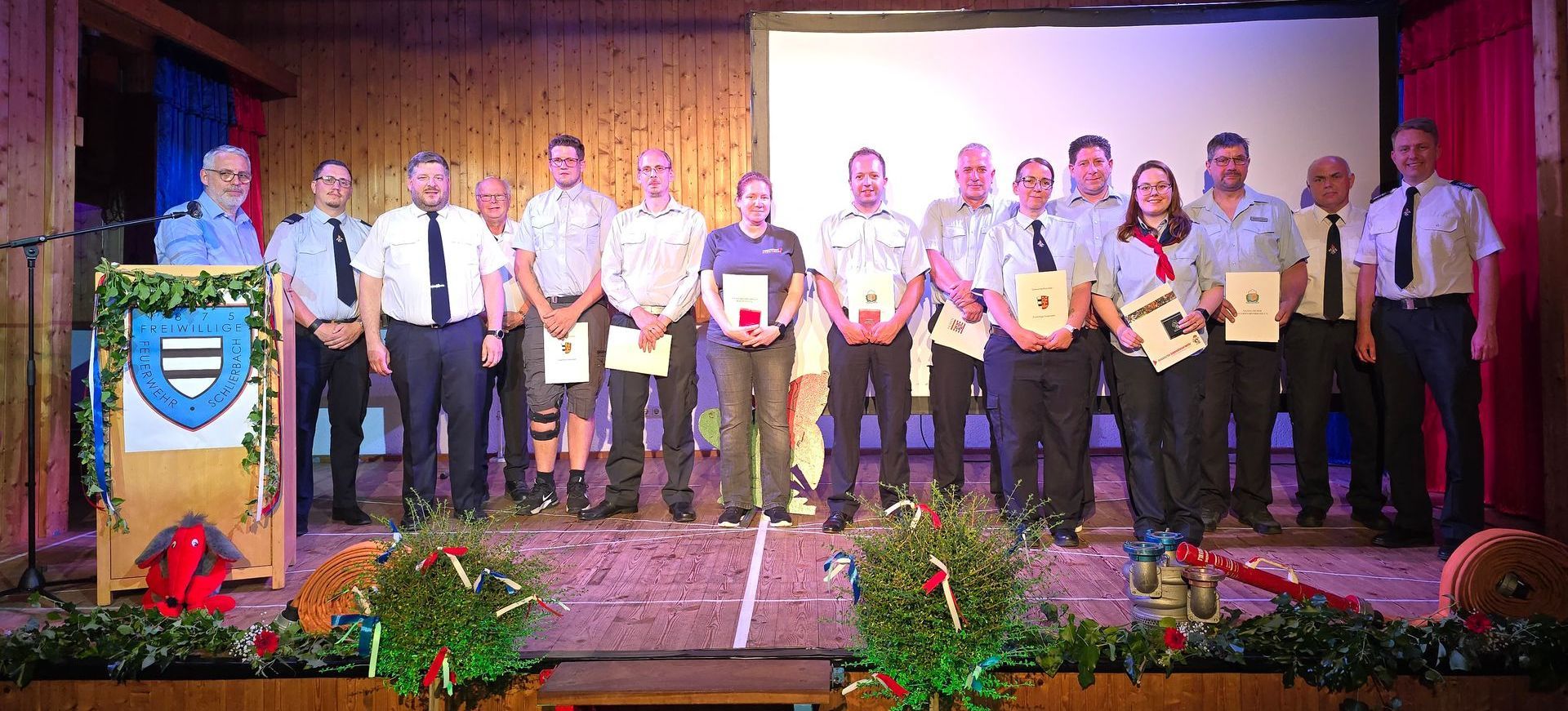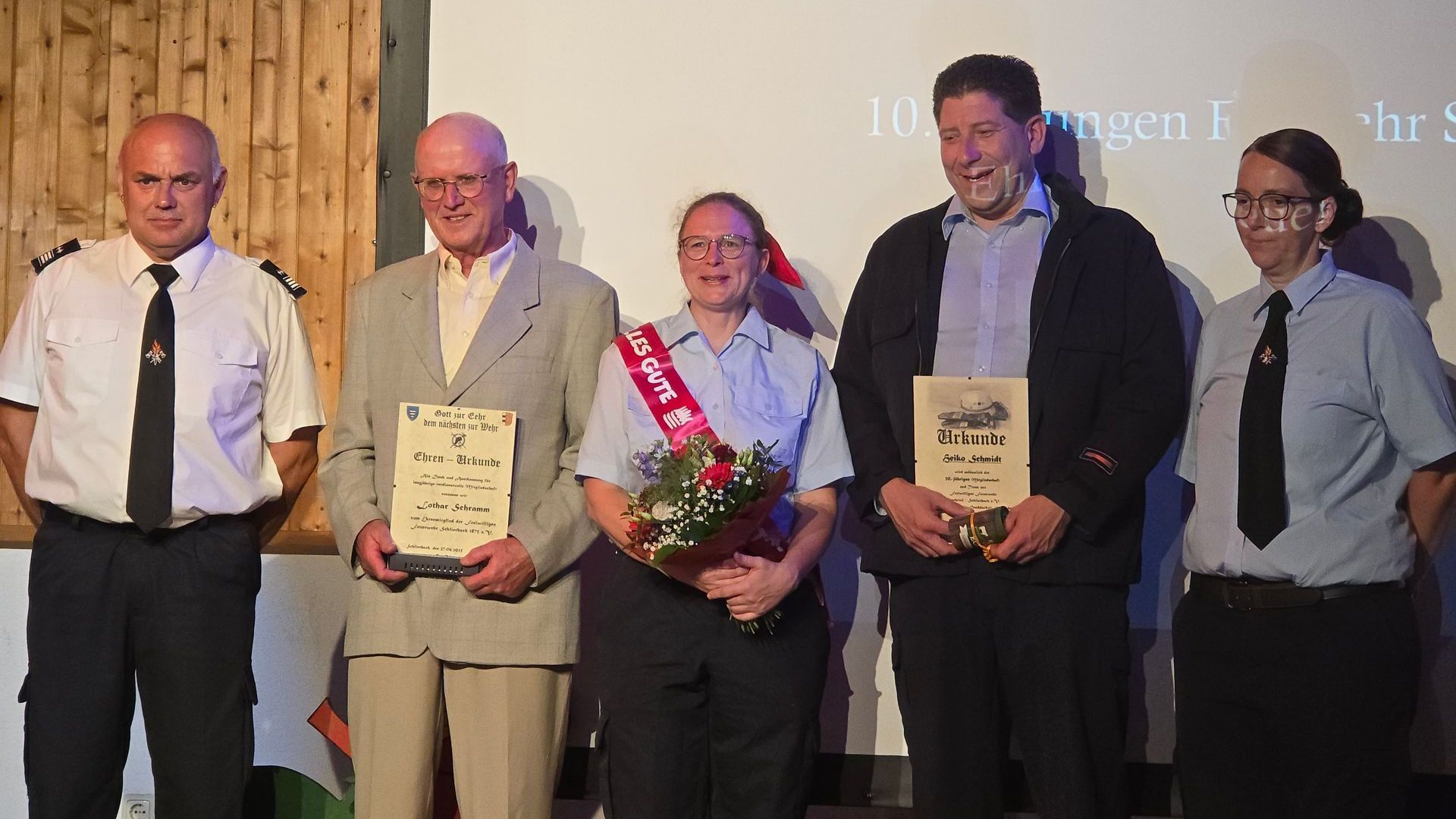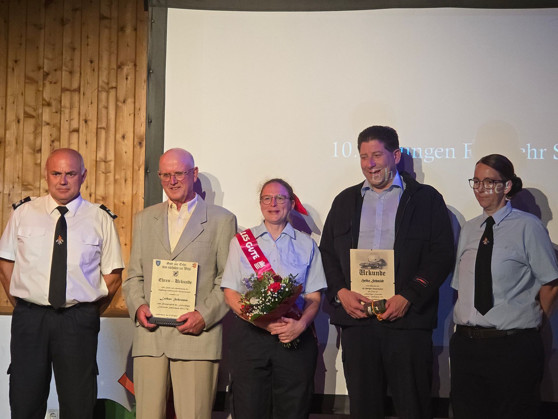 Fortgesetzt wurde das Programm mit der Ausrichtung von Grußworten durch die anwesenden Ehrengäste, in denen vor allem die hervorragende Kinder- und Jugendarbeit betont wurde, denn dadurch ist der Nachwuchs gesichert. Anschließend fanden Ehrungen der Feuerwehr Schlierbach statt. Lothar Schramm erhielt die Ehren-Urkunde als Dank und Anerkennung für langjährige und verdienstvolle Mitgliedschaft. Heiko Schmidt erhielt anlässlich der 30-jährigen Mitgliedschaft und Treue ebenfalls eine Urkunde.