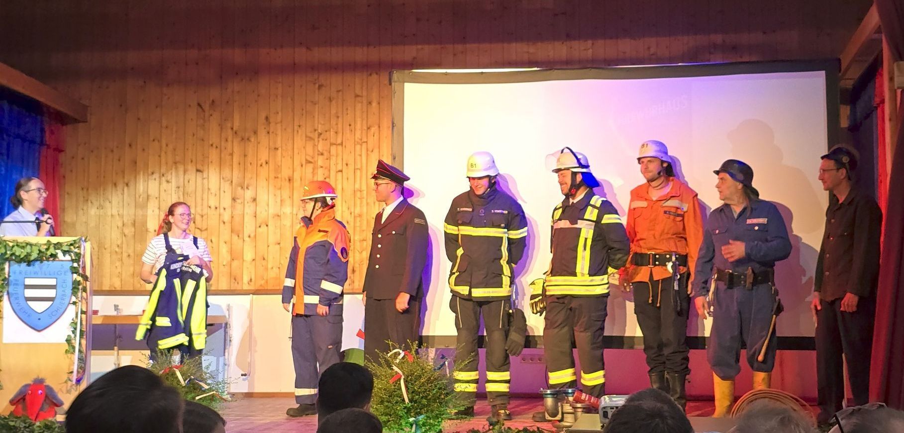 Abwechslungsreich war auch der weitere Verlauf des Abends mit der Aufführung eines Sketches von Bianca Wenzel gemeinsam mit der Freiwilligen Feuerwehr Schlierbach. Darauhin folgte eine Modenschau auf Feuerwehr-Art, bei der die Einsatzkleidung und Uniformen der vergangenen Jahre präsentiert wurden.